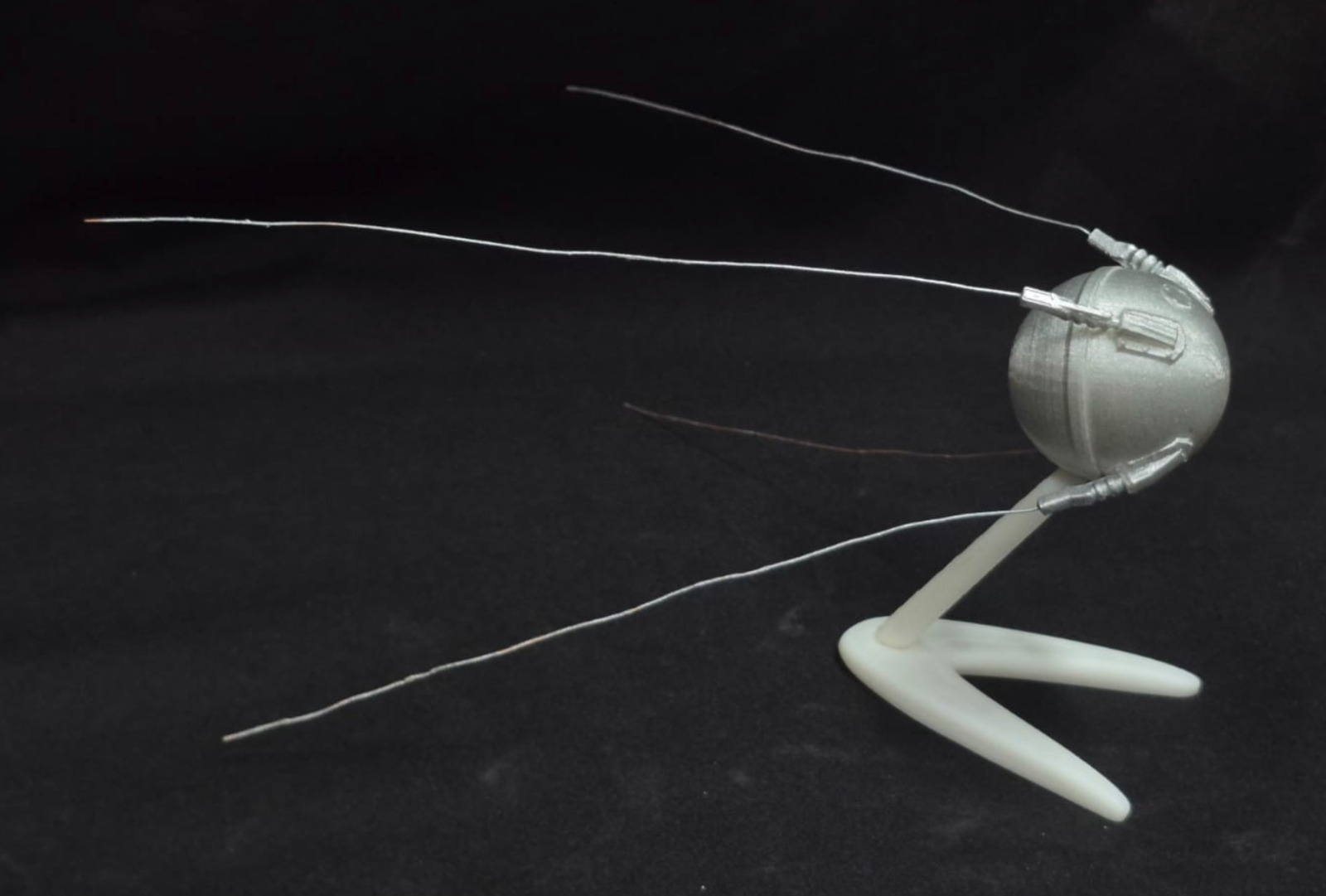 Satélite Sputnik 1 (impressão 3D com filamento) | Modelo ilustrativo do satélite artificial Sputnik 1, feito em impressora 3D com filamento. |