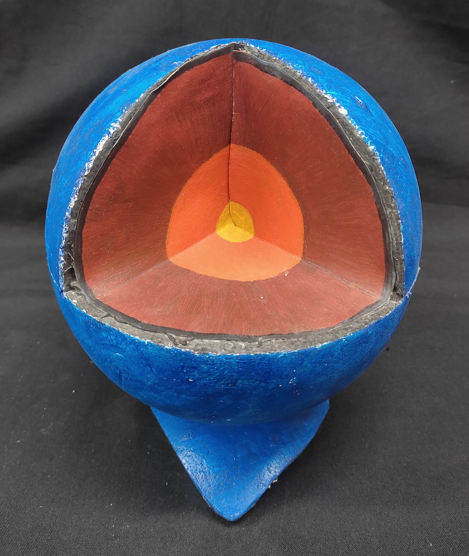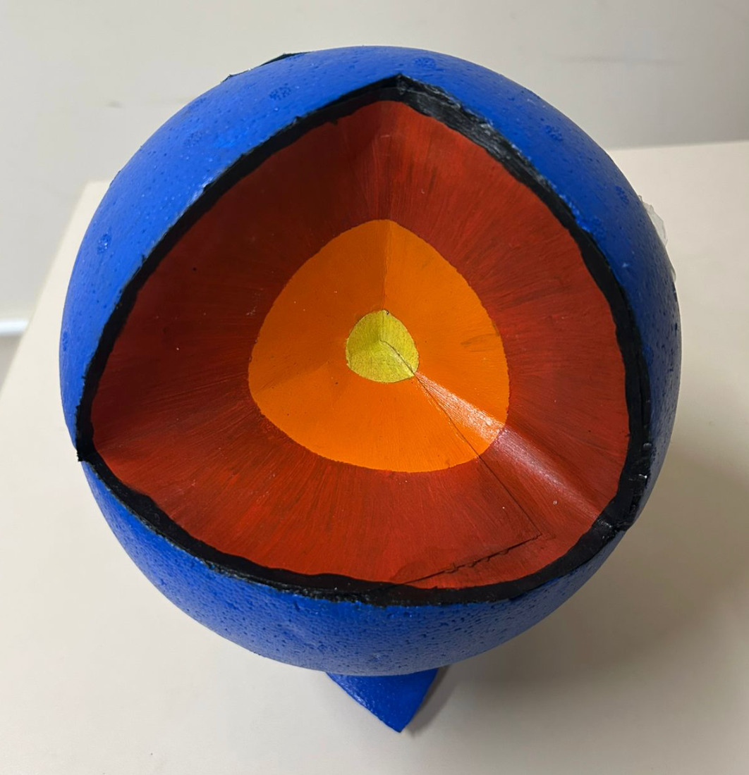 Modelo representativo das camadas internas do planeta Terra, feito com materiais de baixo custo. Neste modelo simplificado, são representadas as seguintes camadas: crosta, manto e núcleo.