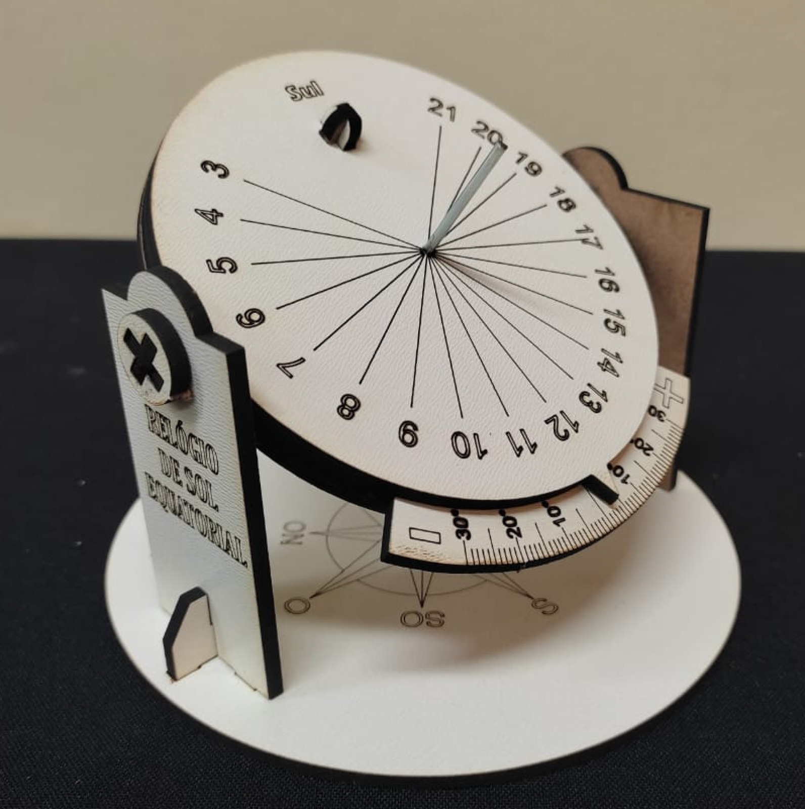 Relógio solar equatorial com ajuste de longitude | Relógio solar equatorial com ajuste de longitude, feito com MDF, utilizando-se uma cortadora e gravadora laser. |