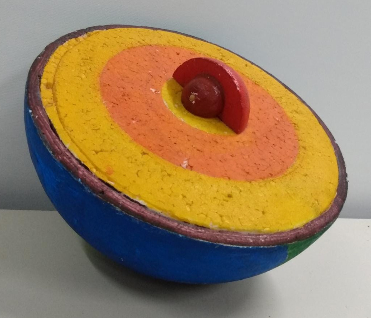 Modelo representativo das camadas internas do planeta Terra, feito com materiais de baixo custo. Neste modelo simplificado, são representadas as seguintes camadas: crosta, manto e núcleo.