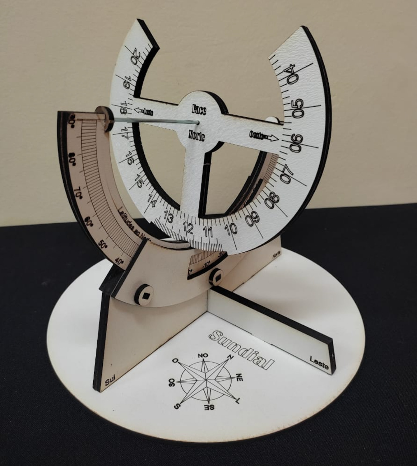 Relógio solar equatorial com ajuste de longitude | Relógio solar equatorial com ajuste de longitude, feito com MDF, utilizando-se uma cortadora e gravadora laser. |