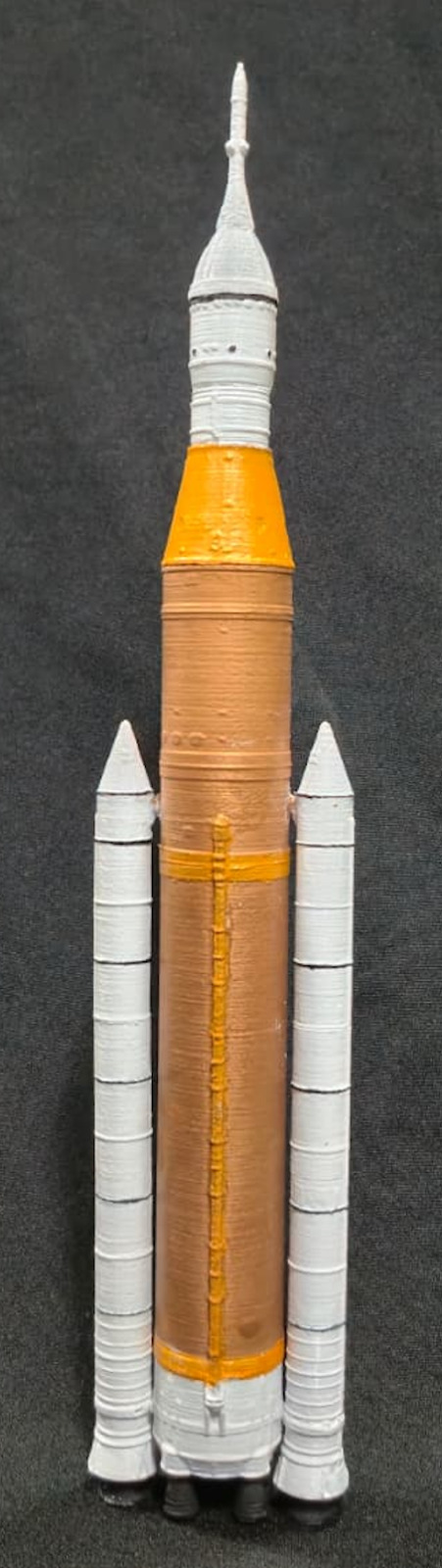 Space Launch System (impressão 3D com filamento) | Representação do foguete Space Launch System, feito em impressora 3D com filamento. |
