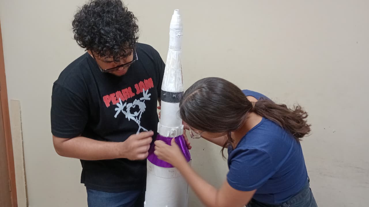Colaboradores Adielson W. S. Monteiro e Sara R. Parente reformando o Foguete Saturno V, em 13 de novembro de 2025. |
